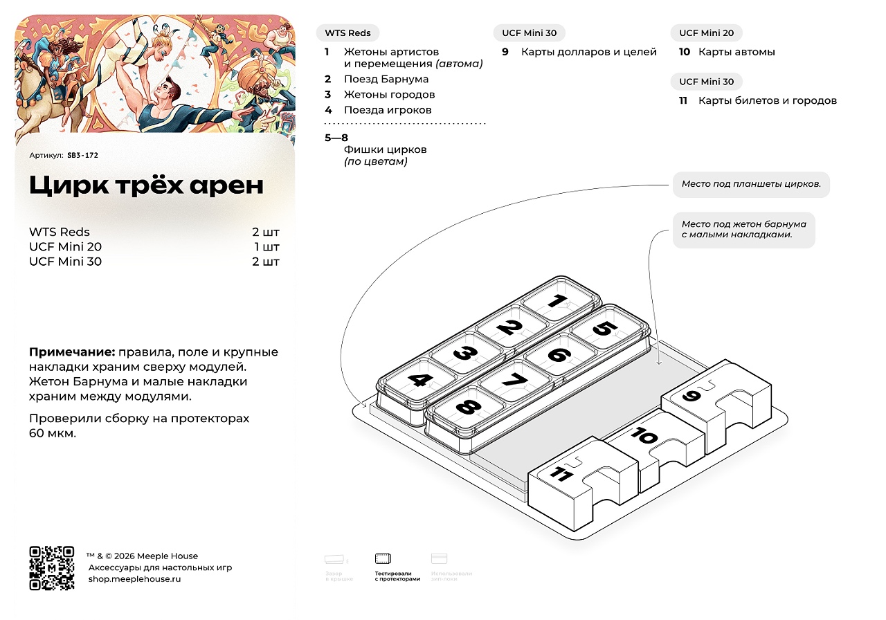2 шт. — WTS Reds. Хранение жетонов артистов и перемещения для автомы. Хранение поезда Барнума, жетонов городов, поездов игроков и фишек цирков по цветам.