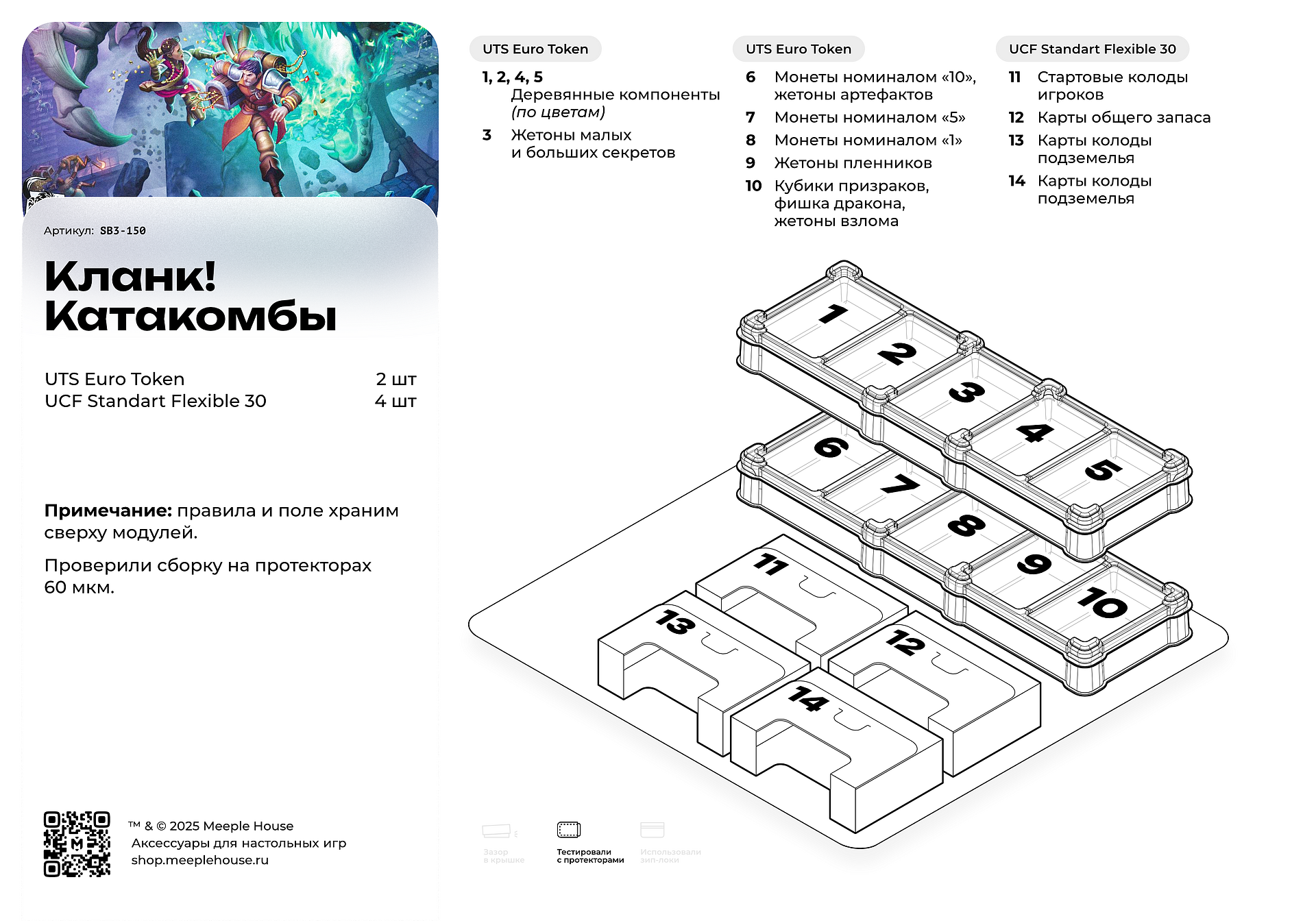 Каждое путешествие в катакомбы уникально, ведь подземелье составляется из тайлов. Вы можете играть только с новой колодой подземелья или добавить карты из других дополнений к Кланку!