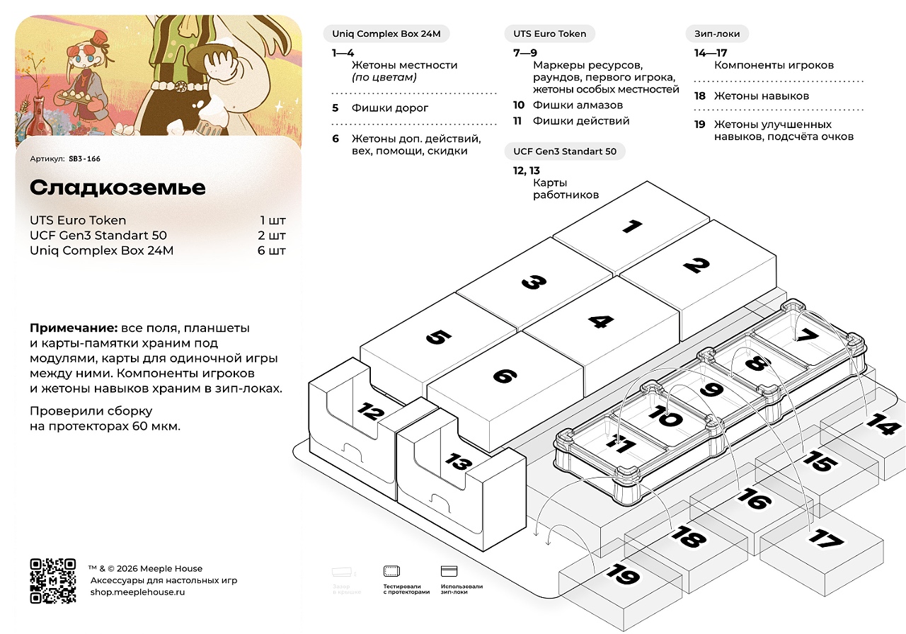 Примечание: Все поля, планшеты и карты-памятки храним под модулями, карты для одиночной игры между ними. Компоненты игроков и жетоны навыков храним в зип-локах.