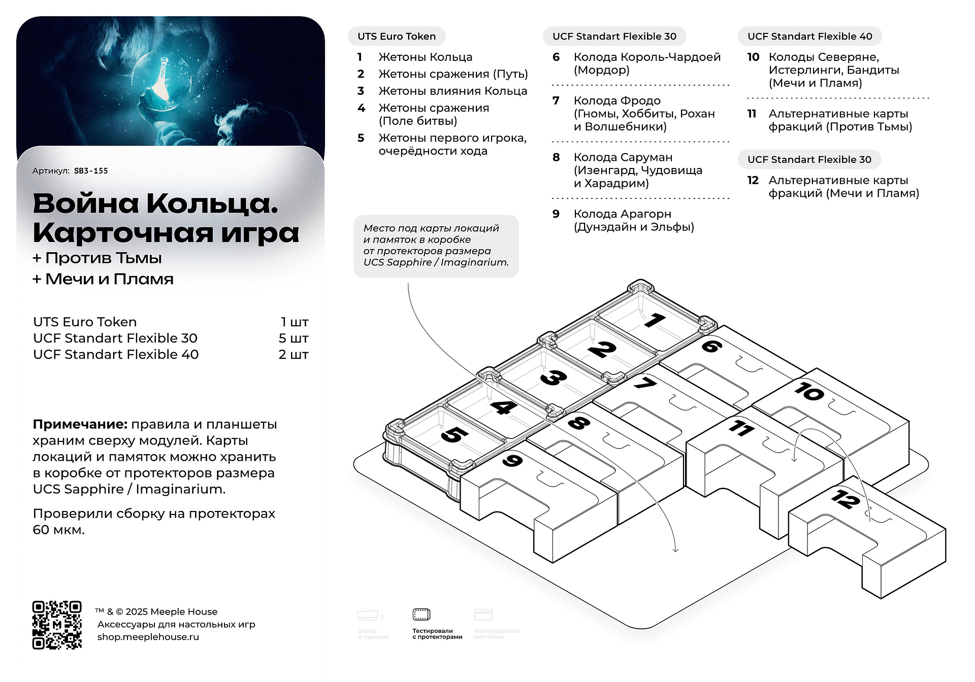 Полное закрытие крышки — коробка закрывается идеально, без зазоров и выступов. Все карты размещены в протекторах толщиной 60 мкм для максимальной защиты . Карты локаций и памяток удобно помещаются в коробку от протекторов UCS Sapphire или Imaginarium