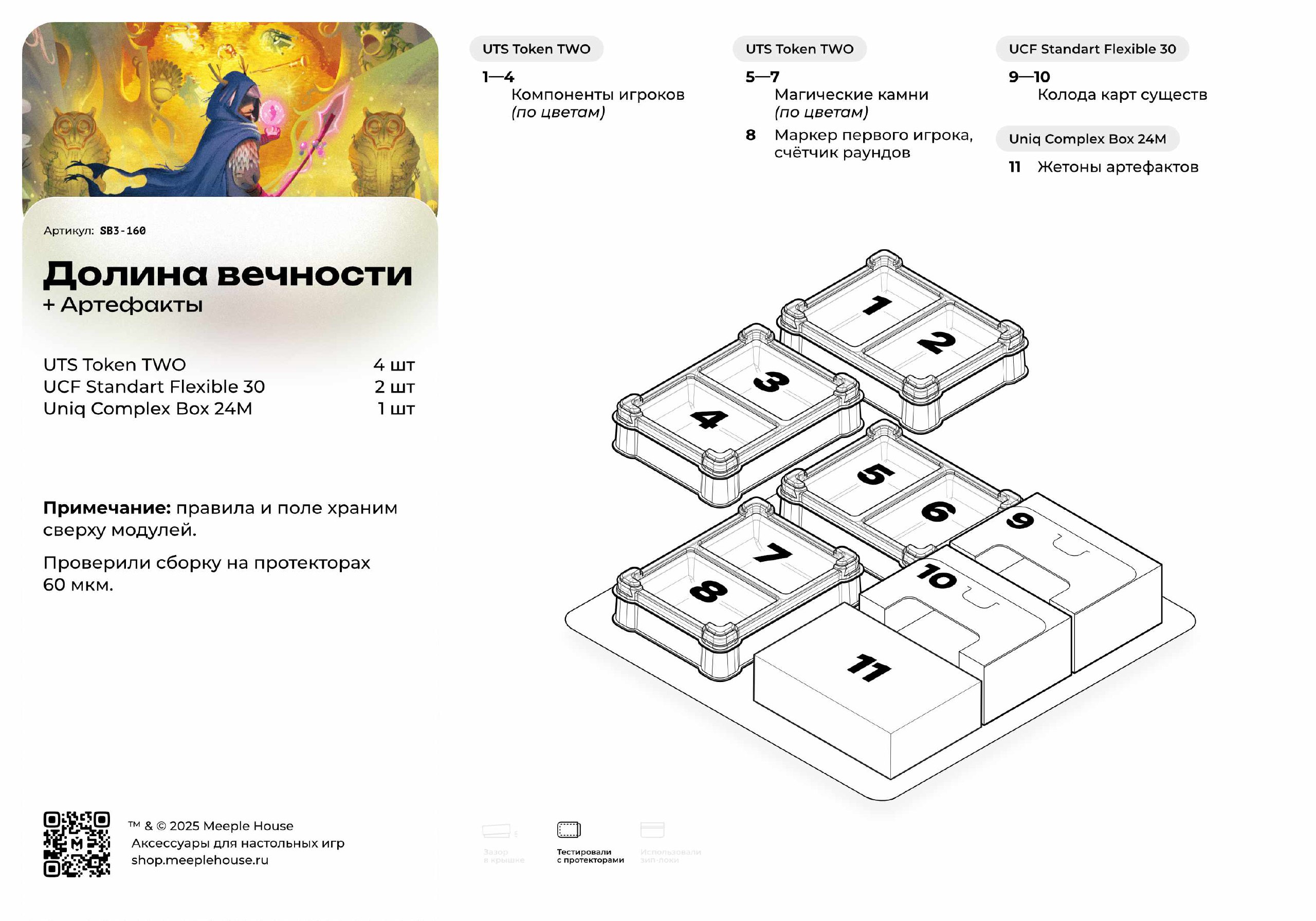 Все игровые элементы удобно рассортированы, что позволяет быстро приступить к новой партии с дополнением. Модули идеально подходят для хранения артефактов, дополнительных карт существ и специальных жетонов. Органайзер создаёт порядок и экономит время при подготовке и сборке игры, помогая полностью погрузиться в атмосферу укрощения духов и монстров.