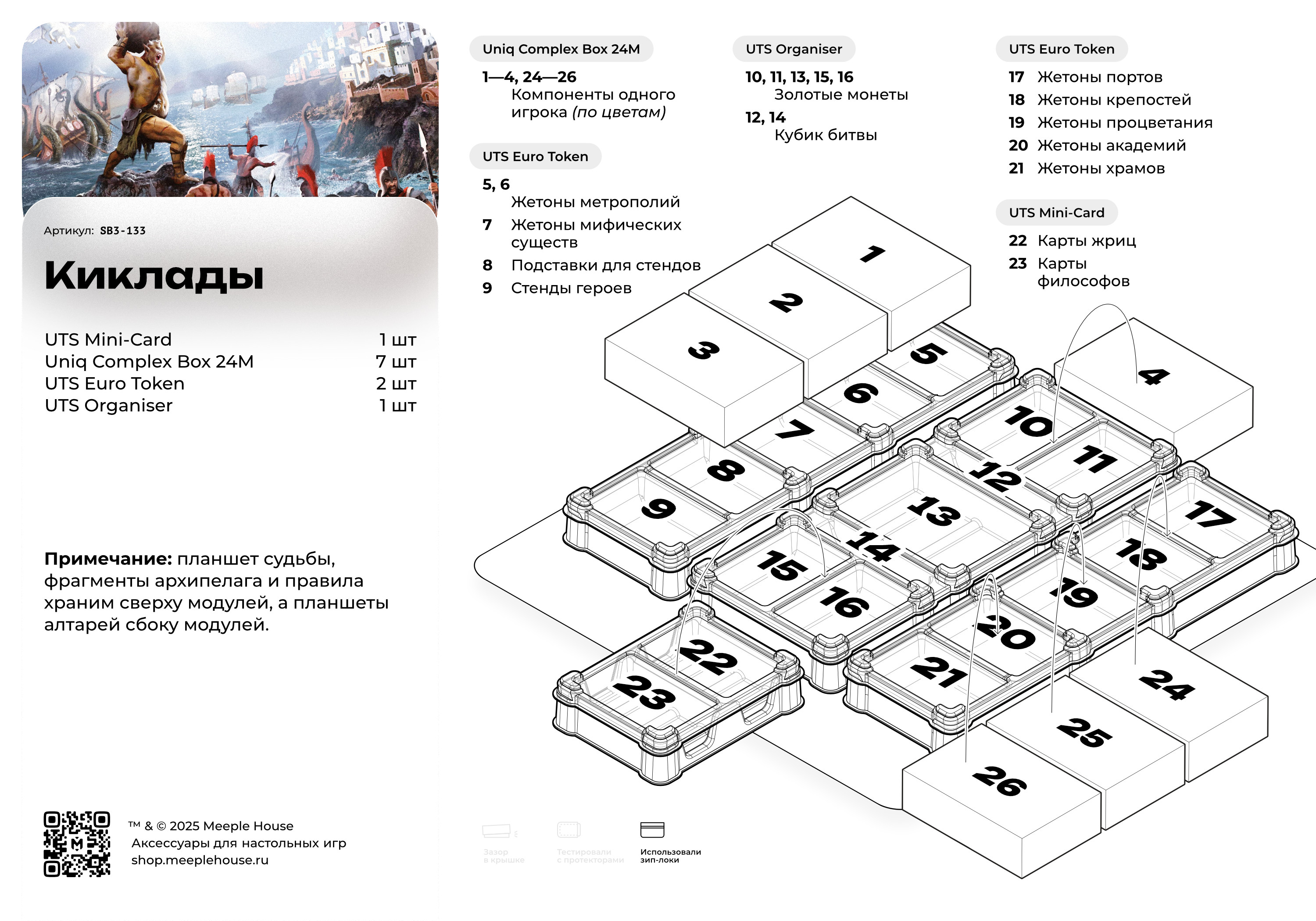 «Киклады. Легендарное издание» — это доработанное и улучшенное переиздание уже ставшей классикой стратегической игры «Киклады», которая сочетает в себе механики аукциона, развития и сражений. Погрузитесь во времена фантастической мифологической Греции, где каждый игрок возглавит одну из фракций и попробует установить свою власть на островах Киклады. Игроки будут копить богатства, совершать подношения, чтобы снискать благосклонность богов, развивать свои города и даже нанимать великих героев и мифических существ для достижения своих целей.