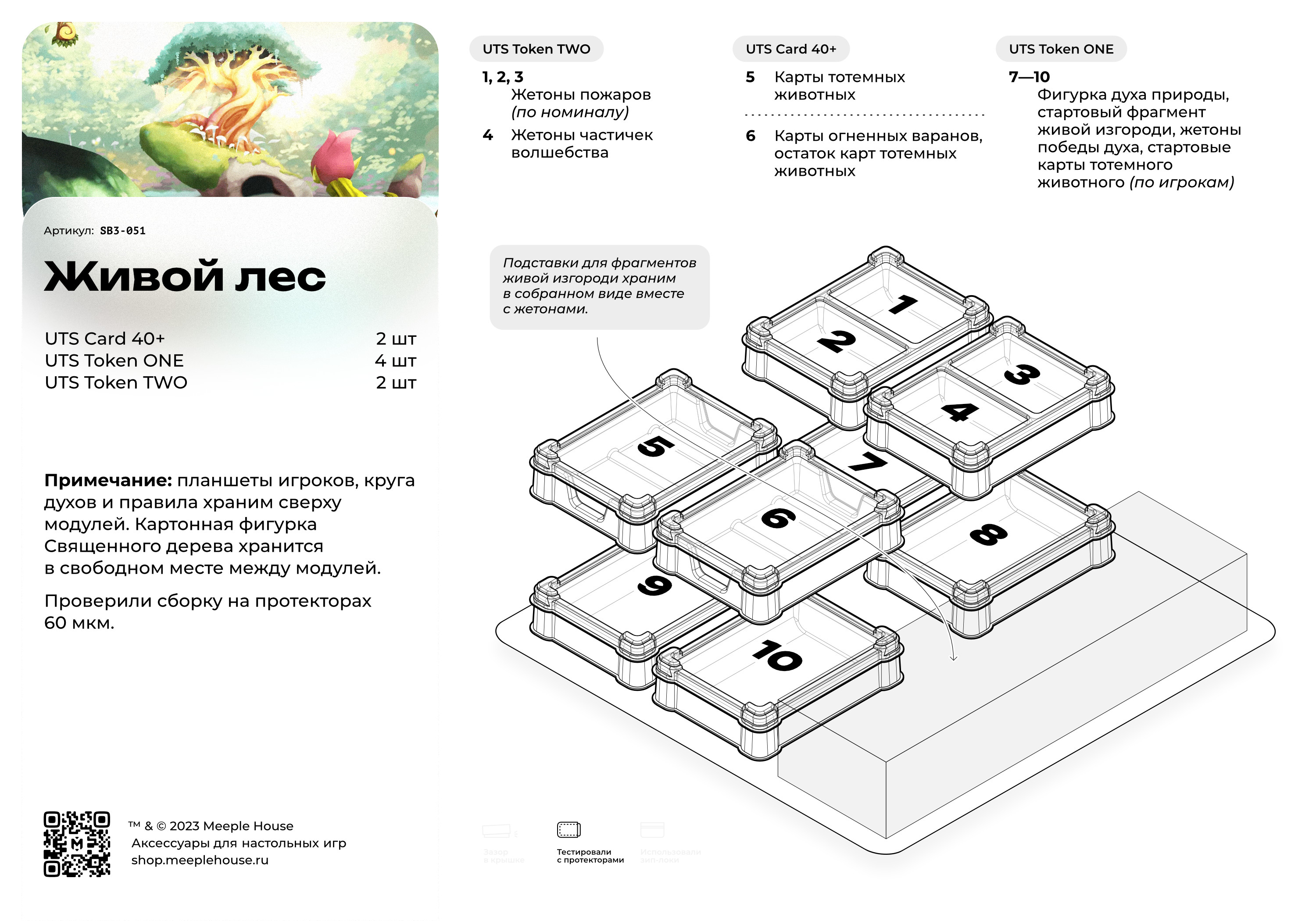 Достичь победной цели вам помогут тотемные животные и круг духов леса. Вы приобретаете карты тотемных животных и дополняете ими личную колоду в течение партии. Перемещаясь по кругу духов, вы получаете бонусные действия и забираете победные жетоны у соперников.