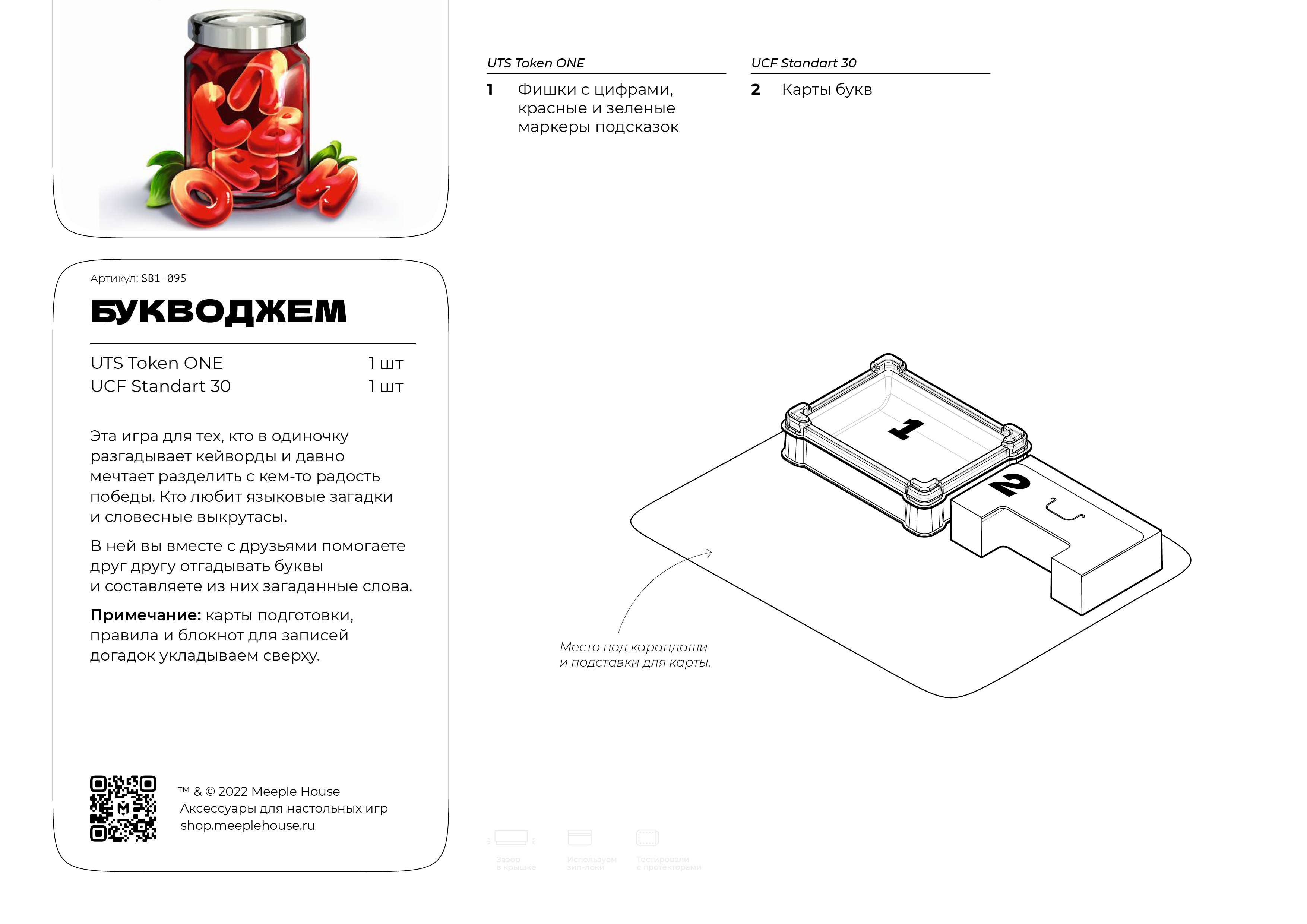 Букводжем – это кооперативная игра, в которой вам предстоит как следует поломать голову. Каждый игрок получает букву, которая видна всем, кроме него. Ваша задача – давать друг другу подсказки, придумывая слова из видимых букв. Но, конечно, эти слова нельзя называть – придётся отмечать буквы фишками с цифрами.