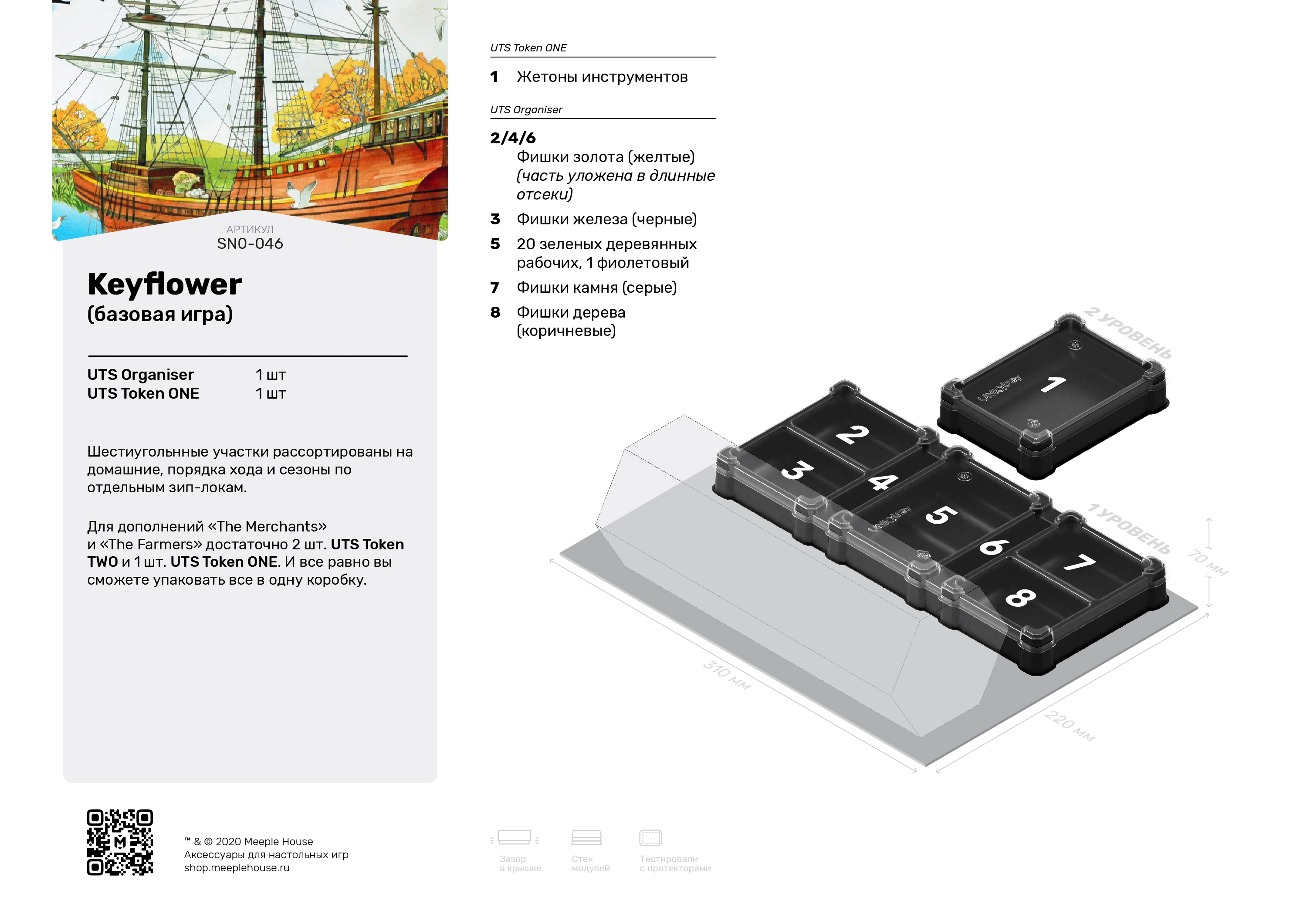 Партия в Keyflower проходит в 4 раунда (времени года): весна, лето, осень и зима. В начале партии у каждого игрока есть участок с домом и случайный набор из восьми синих, красных и желтых рабочих, спрятанных за ширмой. Рабочие нужны, чтобы делать ставки за новые участки для деревни на аукционе, а также чтобы использовать способности участков — даже тех, которые еще никто не присоединил. Выиграв полезное здание для своей деревни, вы сможете в следующий ход привлечь на него рабочих из других деревень. Весной, летом и осенью новые рабочие прибывают на кораблях. Зимой же игроки будут выбирать на аукционе для своих деревень новые участки, каждый из которых принесет обладателю победные очки. Каждая партия в Keyflower подарит вам новые впечатления и потребует применения разных стратегий: в аукционах используются разные участки, во владение игроков приходят разные рабочие. Только самые оптимальные решения позволят вам превзойти оппонентов. Все начинается с самих участков: они шестигранные и всегда располагаются на столе так, что каждый из игроков соотносит себя с одной из граней участка. Именно со своей стороны игрок будет делать ставки своими рабочими. В отличие от других аукционов, вы сможете переместить своих рабочих на другой участок, если поймете, что на этом вам не победить. Рабочие являются не только “аукционной валютой”, но и средством получения ресурсов и уникальных эффектов. Когда вы выставляете рабочего на участок (в вашей деревне, чужой деревне или даже на тот, где еще только идет аукцион), вы имеете возможность воспользоваться благами этого участка и получить ресурсы с него. А чтобы воспользоваться способностью участка еще раз, придется выставить на него хотя бы на одного рабочего больше — но такого же цвета, как и первый. С одной стороны, решается главная проблема жанра worker placement: любым действием всегда может воспользоваться любой игрок, даже если место уже занято. С другой стороны, у игрока может не быть достаточно рабочих нужного цвета, чтобы прийти на уже занятый участок. Ходить в чужие деревни и на участки, которые получат в результате аукциона другие игроки, опасно: все рабочие с них перейдут во владение хозяина этих участков. Тактическая составляющая аукциона потребует от вас хитрости и грамотного просчета. Ваши возможности ограничены количеством имеющихся рабочих и их цветом: если на участок или в аукцион за него выставлен, например, красный рабочий, другим цветам манипуляции на этом участке уже не доступны. Система аукциона с рабочими разных цветов создает динамичный и конфликтный игровой процесс, а “ресурсный движок” — ключевая составляющая большинства евро-стратегий — не становится самоцелью. У игроков появляется возможность не только оптимизировать добычу ресурсов (купить дешевле, продать дороже), но и взаимодействовать с другими игроками, переманивая их рабочих в свою деревню.