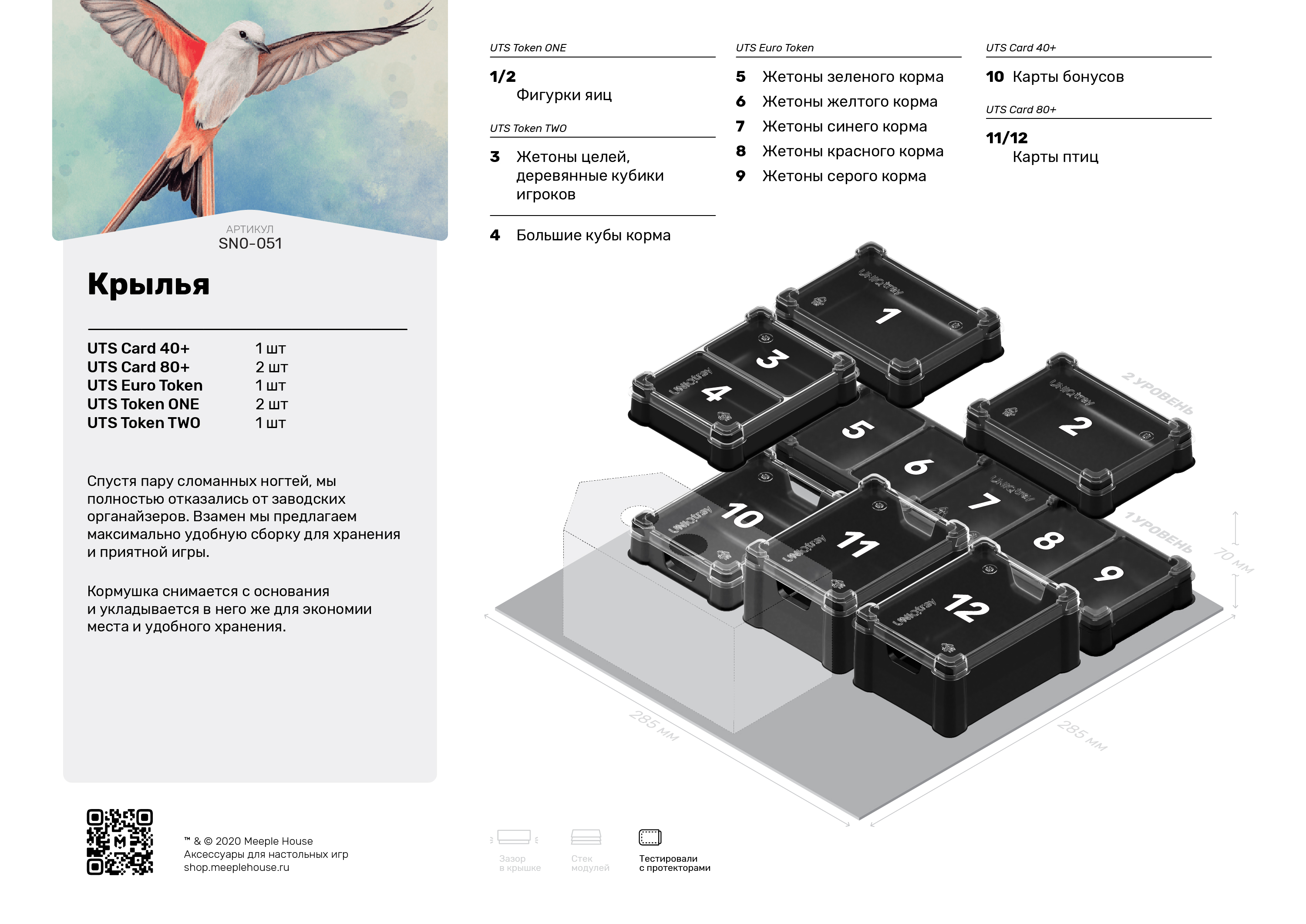 Крылья – это соревновательная стратегия европейской школы геймдизайна. Очень продуманная игра, она проста в освоении и обладает должной динамикой, однако требует от участников умеренной доли концентрации и мозговой активности, потому что путей набора победных очков немало, и задача каждого заключается в выборе наиболее эффективного способа. Кстати в игре вы встретите немало интересных механик, синергия которых получилась легкой и приятной для восприятия. Карты птиц создают цепочки особых свойств, а выполняемые в заповеднике действия позволяют получить дополнительные победные очки.
