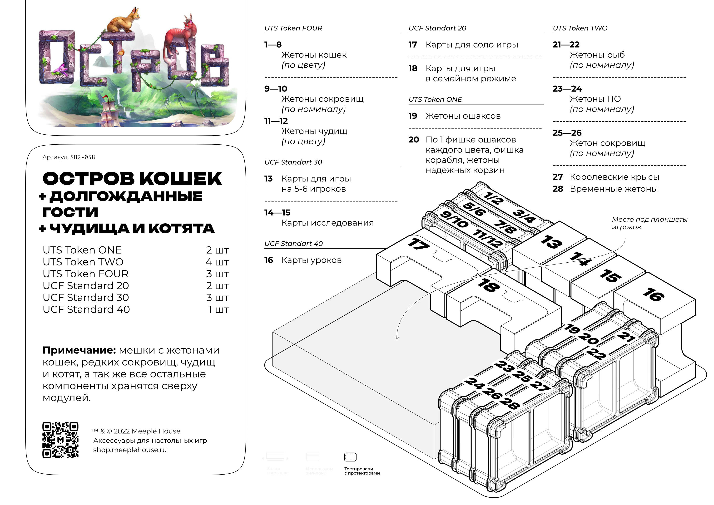 Остров Кошек – это та игра, которая понравится как опытным игрокам, так и новичкам. Благодаря простым правилам, в нее возможно играть с детьми 10 лет. Кроме этого, есть упрощенный режим для детей от 8 лет, а также правила соло-игры.Долгожданные Гости – это расширение, которое позволяет играть в Остров Кошек впятером или вшестером, а также добавляет новые планшеты кораблей, карты и жетоны. Теперь возможностей становится еще больше!