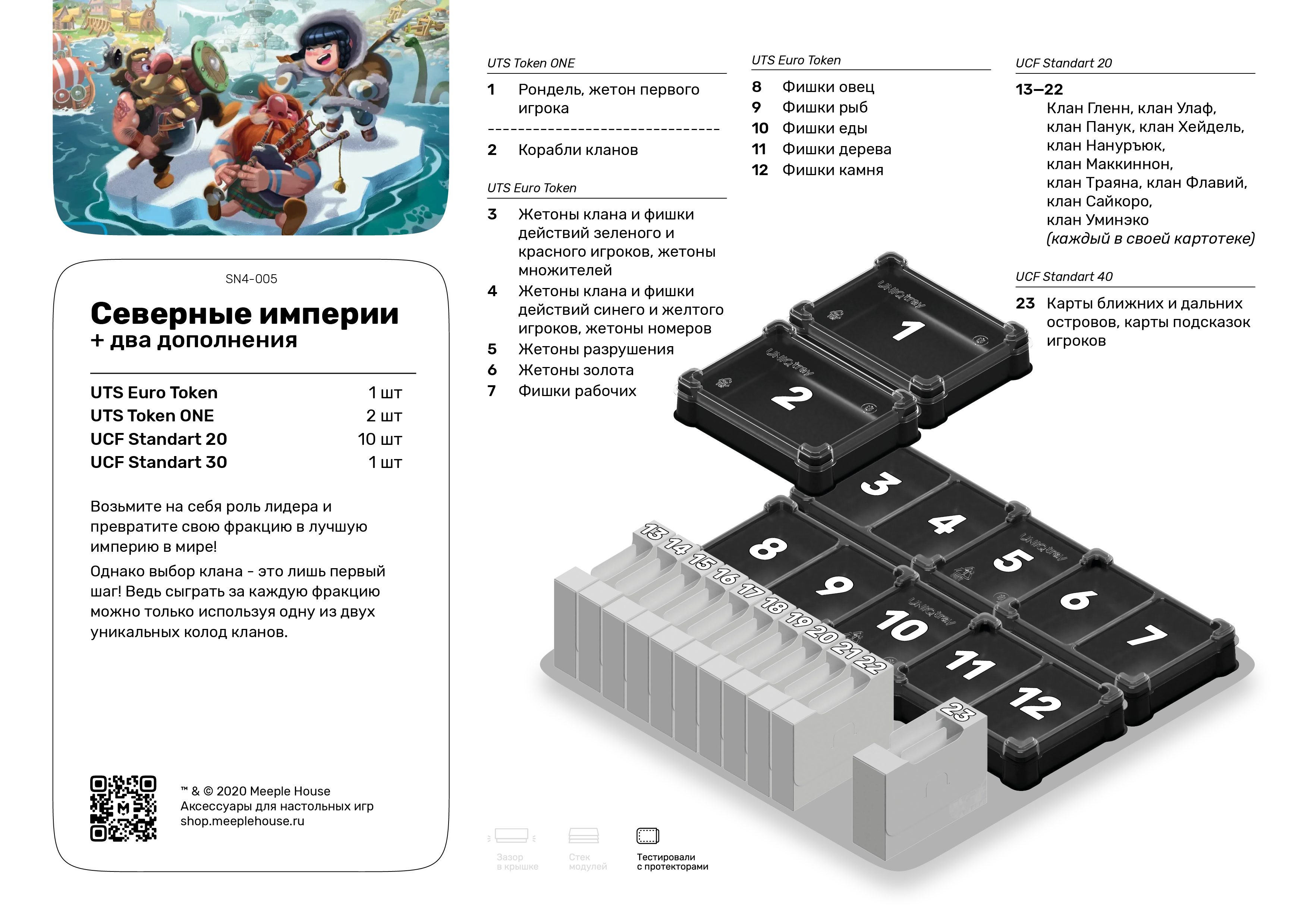 Возьмите на себя роль лидера и превратите свою фракцию в лучшую империю в мире! Однако выбор фракции - это лишь первый шаг! Ведь сыграть за каждую фракцию можно только используя одну из двух уникальных колод кланов. И вам не нужно собирать или изменять их - в базовой игре игроки найдут 6 колод, готовых к использованию прямо из коробки. Каждая из них предлагает свой уникальный стиль игры! Кроме того, в Северных Империях игроков ждут новые ресурсы, кольцо выбора действий и плаванье на дальние острова.