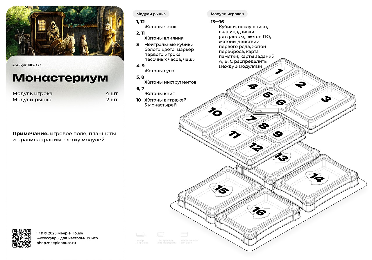 Мы с гордостью представляем вам собственный органайзер для игры Монастериум, который был разработан нами, протестирован игроками и изготовлен из высококачественной пленки PET. Этот органайзер создан с учетом наших принципов: слои не имеют строгого порядка — вы можете укладывать их так, как вам удобно! Игровое поле может быть сверху, снизу или в середине — выбор за вами.